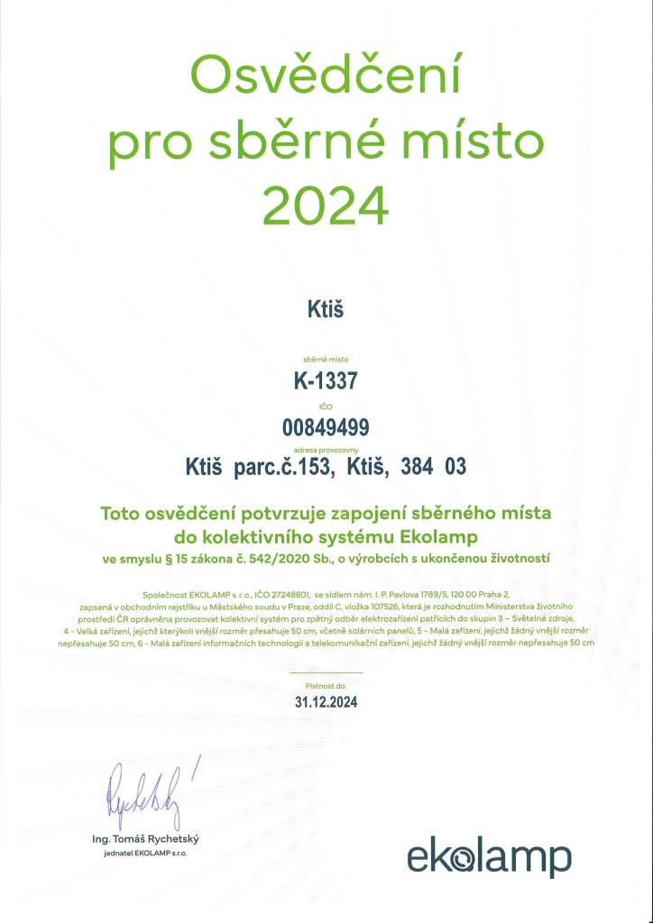 Osvědčení pro sběrné místo 2024